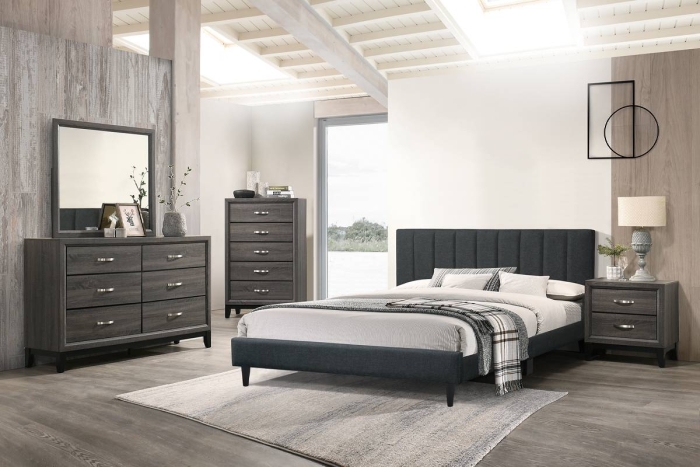 Evolve Your Resting Place With A Bedframe That Speaks Volumes With Hues Of Grey And Definition. It Features A Headboard With Vertical Tufting And A Slat Mattress Support. Available In Grey And Charcoal.